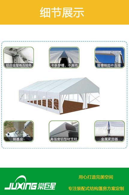弧頂篷房R系列的結(jié)構(gòu)采用單元組合式設(shè)計,長度可按3米或5米間距增長或減少,支架材料采用氧化鋁合金,篷布采用阻燃的雙面PVC合成纖維布,阻燃標準符合歐洲標準。弧頂篷是一種獨特的篷房造型,它是在人字形篷的基礎(chǔ)上,合理運用了中國傳統(tǒng)建筑的設(shè)計元素,將篷頂斜梁進行預彎曲后達到的弧形效果。弧頂篷的特點:外形美觀,圓弧形屋頂線條優(yōu)美,內(nèi)部空間大。使用弧形篷作為大型活動,臨時展廳的更具時代感弧頂篷房R系列設(shè)計堅固耐用,抗風速達100公里/小時,拆卸快捷方便,儲運體積小。是作為臨時或永久建筑的很好選擇。